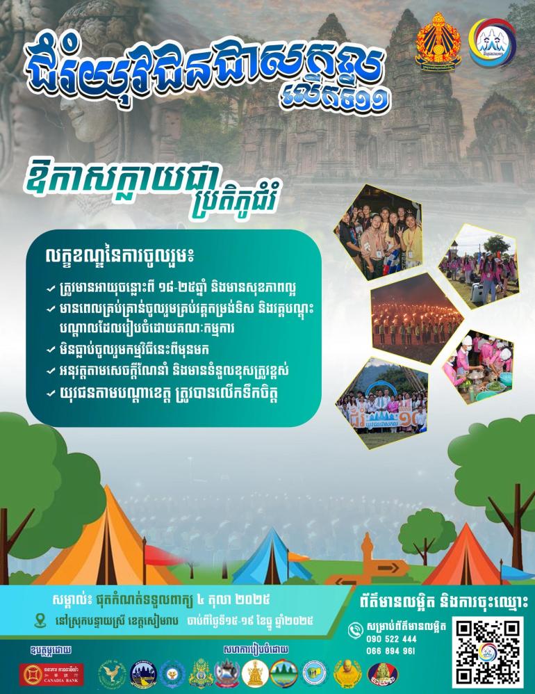 ក្រសួងអប់រំ បានបើកឱកាសដល់យុវជនមកពីគ្រប់តំបន់ គ្រប់ខេត្តក្រុង ដើម្បីដាក់ពាក្យចូលរួមជាប្រតិភូក្នុងកម្មវិធីជំរំយុវជនជាសកលលើកទី១១ ក្រោមប្រធានបទ៖ “យុវជននិងការអប់រំនៅកម្ពុជាឆ្នាំ២០៣០”។ កម្មវិធីនឹងប្រព្រឹត្តទៅនៅថ្ងៃទី ១៥ ដល់ថ្ងៃទី ១៩ ធ្នូ ២០២៥ នៅស្រុកបន្ទាយស្រី ខេត្តសៀមរាប។