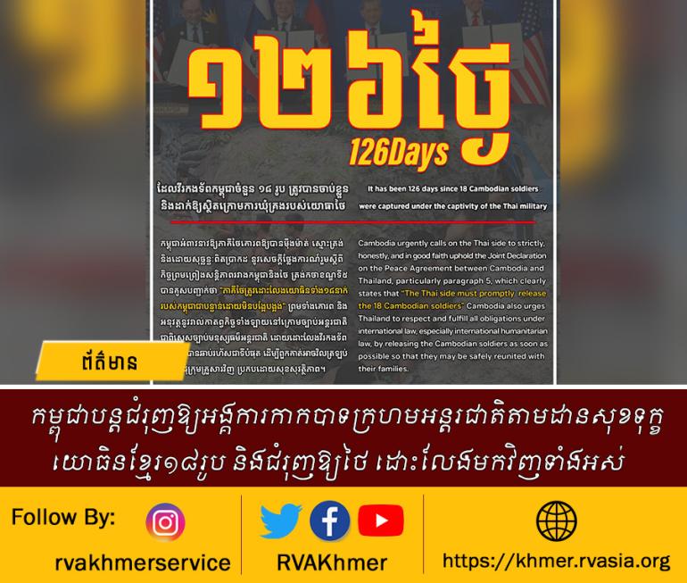 នៅថ្ងៃទី២ ខែធ្នូ ឆ្នាំ២០២៥នេះ ជាថ្ងៃទី១២៦ហើយ ដែលវីរកងទ័ពកម្ពុជាចំនួន ១៨រូប ត្រូវបានចាប់ខ្លួន និងដាក់ឱ្យស្ថិតក្រោមការឃុំគ្រងរបស់យោធាថៃ។ កម្ពុជាអំពាវនាវឱ្យភាគីថៃគោរពឱ្យបានម៉ឺងម៉ាត់ ស្មោះត្រង់ និងដោយសុច្ឆន្ទៈពិតប្រាកដ នូវសេចក្តីថ្លែងការណ៍រួមស្តីពីកិច្ចព្រមព្រៀងសន្តិភាពរវាងកម្ពុជានិងថៃ ត្រង់កថាខណ្ឌទី៥ បានគូសបញ្ជាក់ថា «ភាគីថៃត្រូវដោះលែងយោធិនទាំង១៨នាក់របស់កម្ពុជាជាបន្ទាន់ដោយមិនបង្អែបង្អង់» ព្រមទាំងគោរពនិងអនុវត្តនូវរាល់កាតព្វកិច្ចទាំងឡាយនៅក្រោមច្បាប់អន្តរជាតិ ជាពិសេសច្បាប់មនុស្សធម៌អន្តរជាតិ ដោយដោះលែងវីរកងទ័ពកម្ពុជាឱ្យបានឆាប់រហ័សជាទីបំផុត ដើម្បីពួកគាត់អាចវិលត្រឡប់មកជួបជុំក្រុមគ្រួសារវិញ ប្រកបដោយសុខសុវត្ថិភាព។
