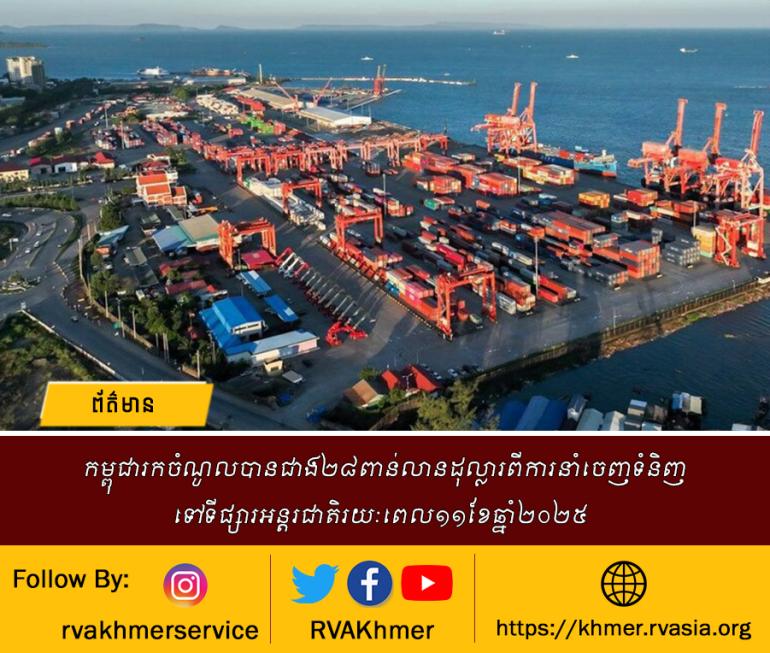 រយៈពេល១១ខែ ឆ្នាំ២០២៥ កម្ពុជារកចំណូលបានជាង២៨ពាន់លានដុល្លារពីការនាំចេញទំនិញទៅកាន់ទីផ្សារអន្តរជាតិនានាទូទាំងពិភពលោក កើនឡើង១៦.១០% បើធៀបរយៈពេលដូចគ្នាក្នុងឆ្នាំ២០២៤ ដែលមានចំនួនត្រឹមជាង២៤ពាន់លានដុល្លារ។