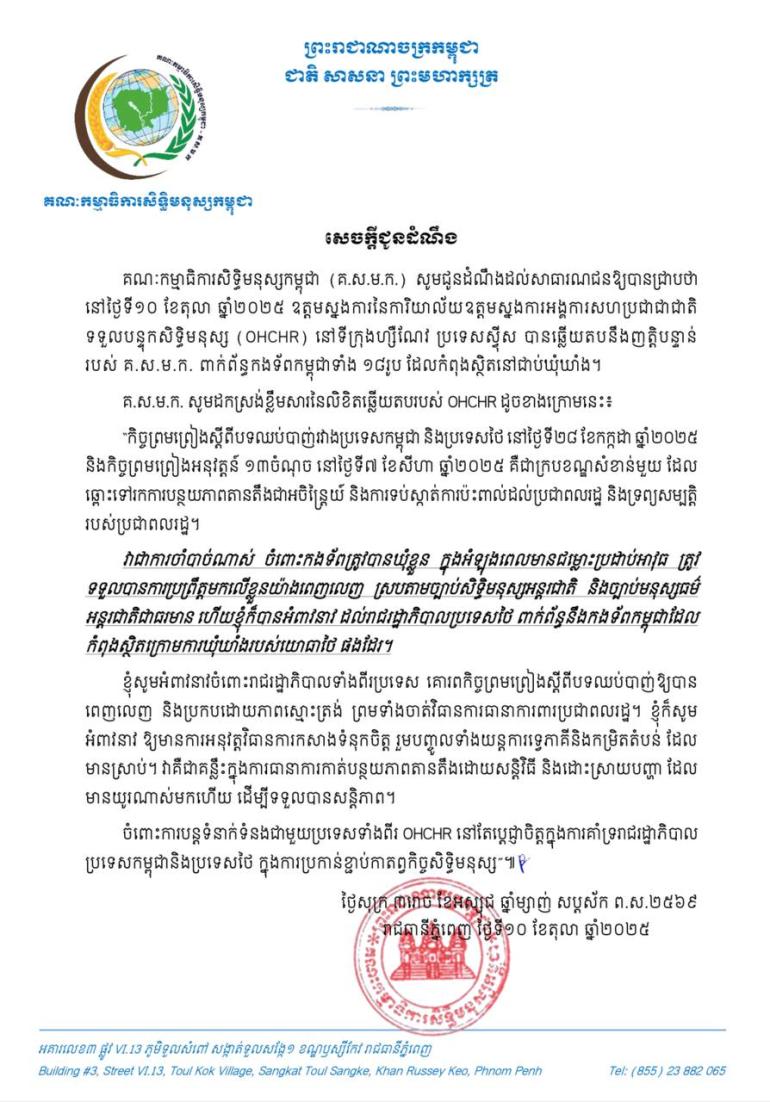 ការិយាល័យសិទ្ធិមនុស្សUN នាថ្ងៃទី១០ តុលា បានបញ្ជាក់មកកាន់គណៈកម្មាធិការសិទ្ធិមនុស្សកម្ពុជាថា កងទ័ពរបស់កម្ពុជាទាំង១៨នាក់ ដែលត្រូវបានឃុំខ្លួន ត្រូវបានទទួលការថែទាំយ៉ាងពេញលេញ ស្របតាមច្បាប់សិទ្ធិមនុស្សអន្តរជាតិ និងច្បាប់មនុស្សធម៌អន្តរជាតិជាធរមាន ព្រមទាំងអំពាវនាវដល់រាជរដ្ឋាភិបាលថៃ ពាក់ព័ន្ធនឹងកងទ័ពកម្ពុជាដែលកំពុងស្ថិតក្រោមការឃុំឃាំងរបស់យោធាថៃ និងជំរុញឱ្យថៃគោរពបទឈប់បាញ់។