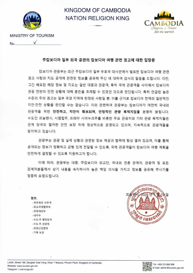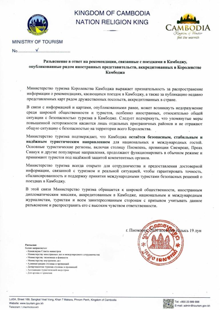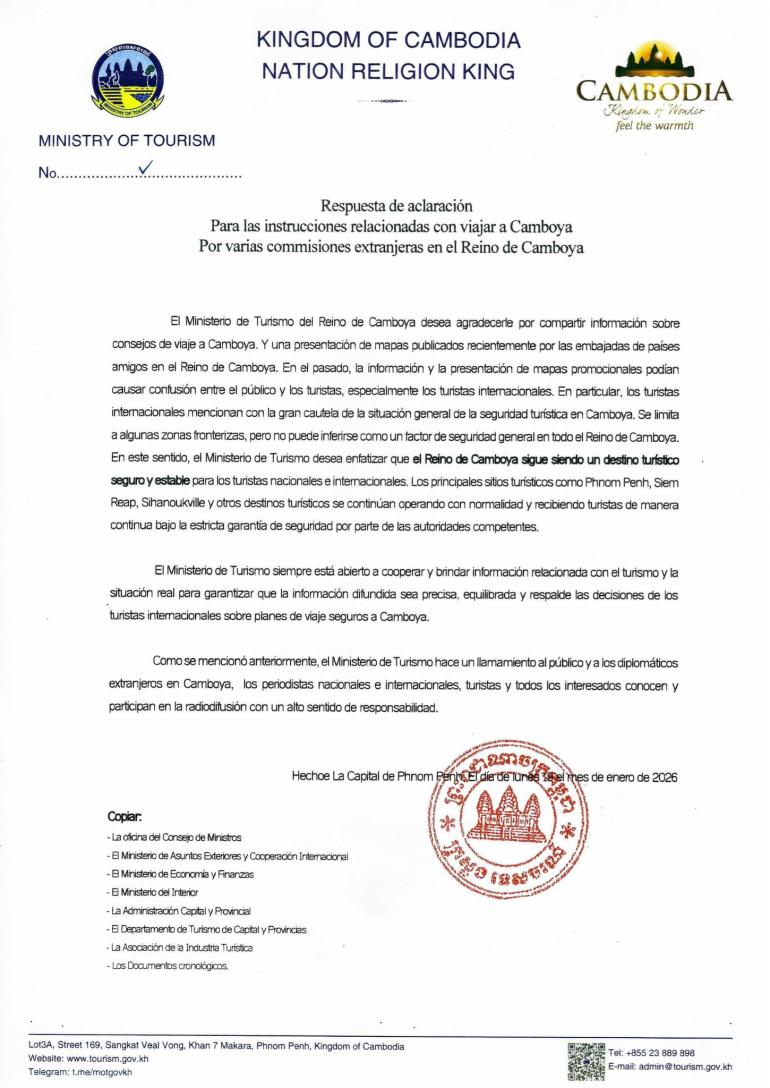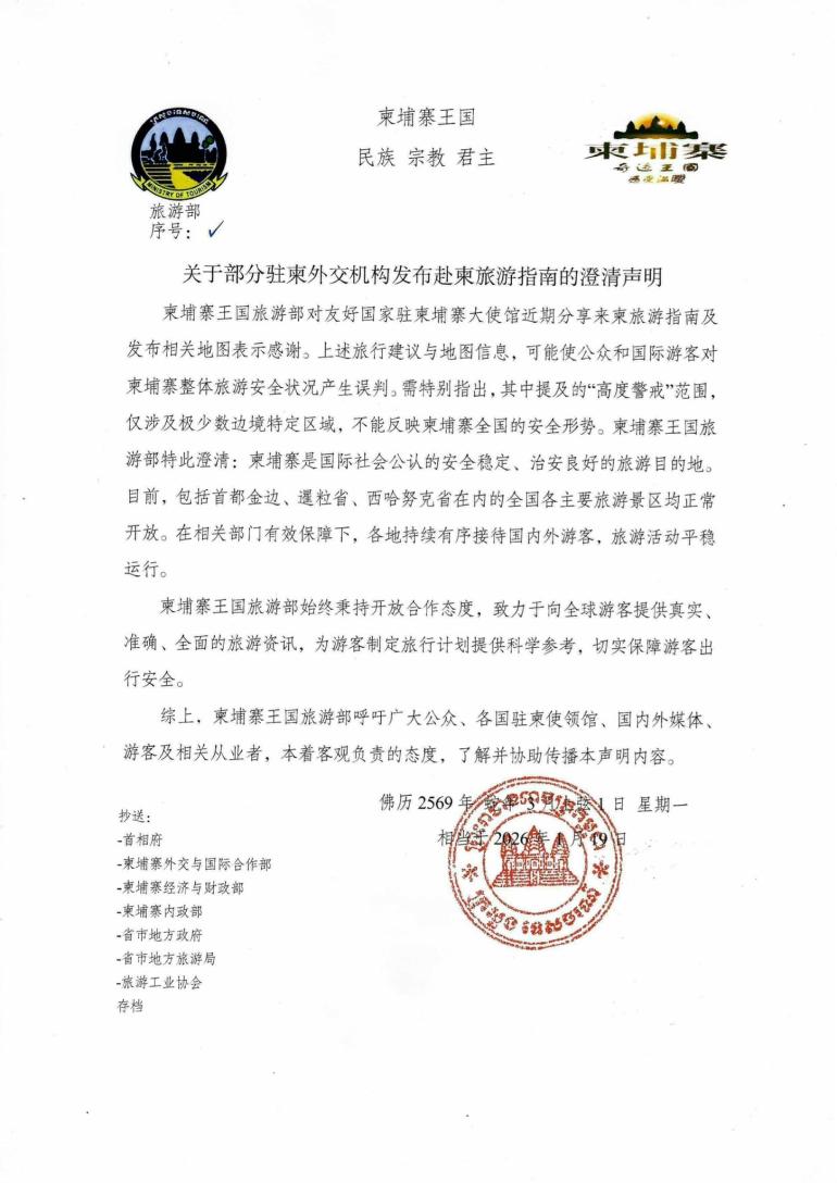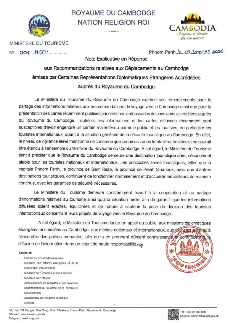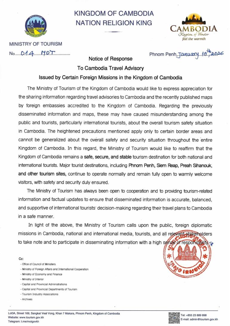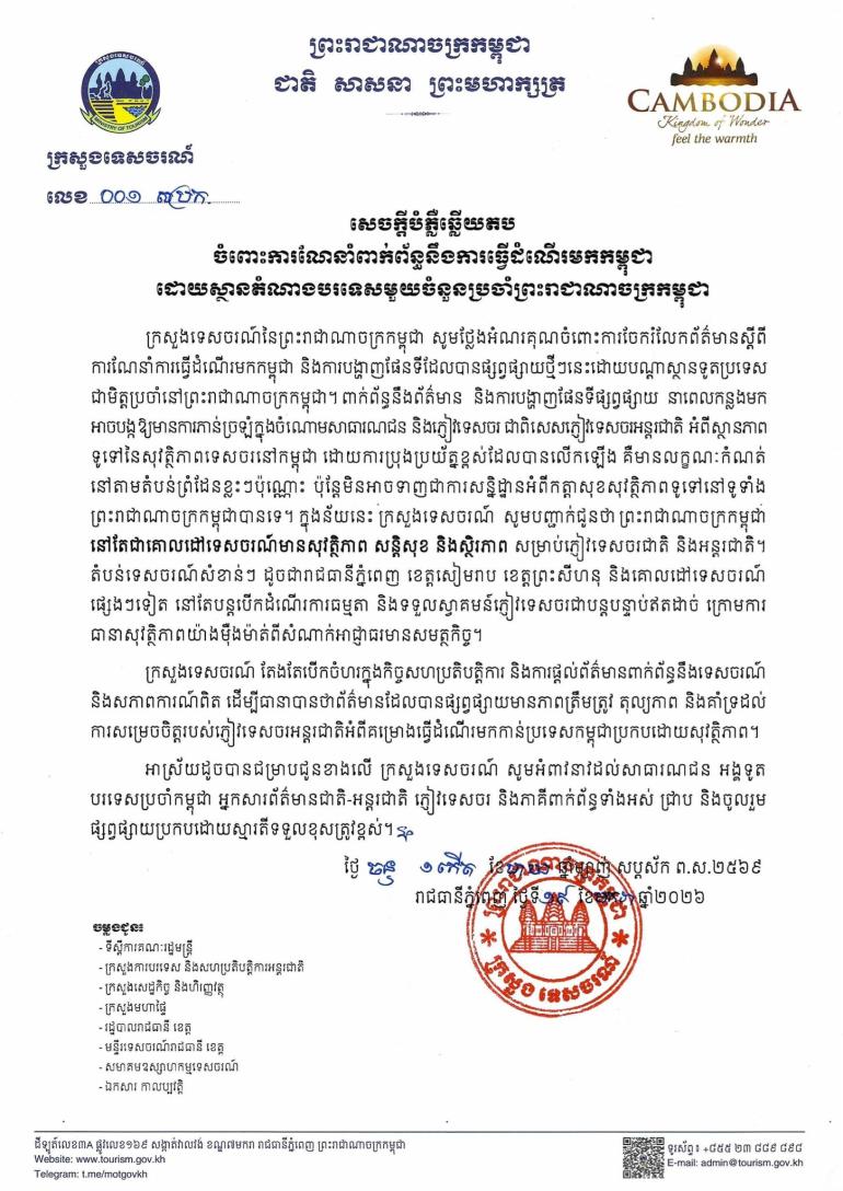 យោងតាមសេចក្តីបំភ្លឺឆ្លើយតប ចំពោះការណែនាំពាក់ព័ន្ធ នឹងការធ្វើដំណើរមកកម្ពុជា ដោយស្ថានតំណាងបរទេសមួយចំនួន ប្រចាំព្រះរាជាណាចក្រកម្ពុជា នាថ្ងៃទី១៩ ខែមករា ឆ្នាំ២០២៦នេះ ក្រសួងទេសចរណ៍ បានថ្លែងអំណរគុណ ចំពោះការចែករំលែកព័ត៌មានស្តីពី ការណែនាំការធ្វើដំណើរមកកម្ពុជា និងការបង្ហាញផែនទីដែលបានផ្សព្វផ្សាយថ្មីៗនេះ ដោយបណ្តាស្ថានទូតប្រទេស ជាមិត្តប្រចាំនៅព្រះរាជាណាចក្រកម្ពុជា។