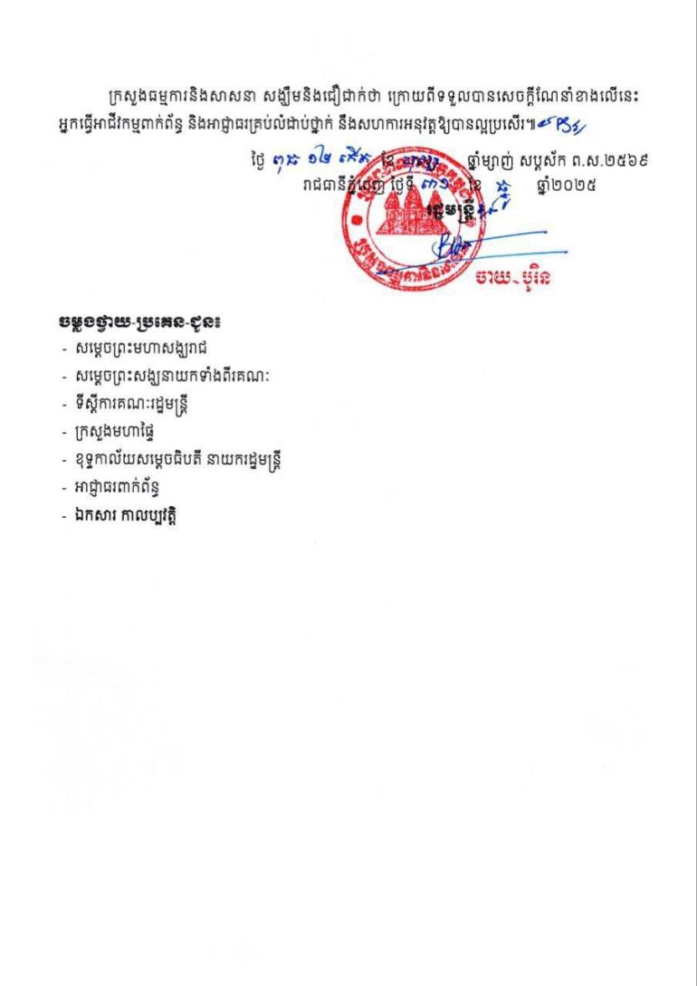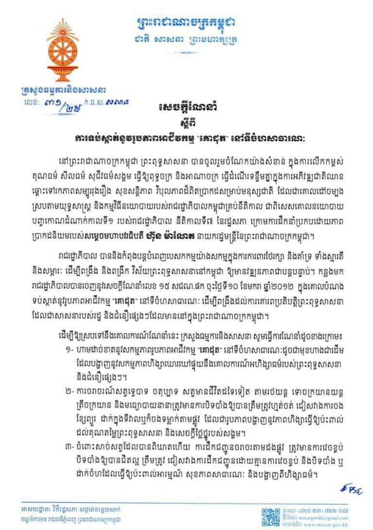 យោងតាមសេចក្តីណែនាំស្តីពីការបង្ការ ដែលចុះហត្ថលេខាដោយ លោកបណ្ឌិត ចាយ បូរិន រដ្ឋមន្ត្រីក្រសួងធម្មការ និងសាសនា កាលពីថ្ងៃទី៣១ ខែធ្នូ បានបញ្ជាក់ថា នៅក្នុងព្រះរាជាណាចក្រកម្ពុជា ព្រះពុទ្ធសាសនាបានរួមចំណែកយ៉ាងសំខាន់ក្នុងការលើកកម្ពស់គុណធម៌ សីលធម៌ និងសីលធម៌សង្គម ដែលធ្វើឱ្យពុទ្ធសាសនិក និងព្រះរាជាណាចក្រកម្ពុជា ឈានទៅមុខជាមួយគ្នាក្នុងការអភិវឌ្ឍជាតិឆ្ពោះទៅរកភាពរុងរឿង សន្តិភាព និងវិបុលភាពពិតប្រាកដសម្រាប់មនុស្សជាតិ។