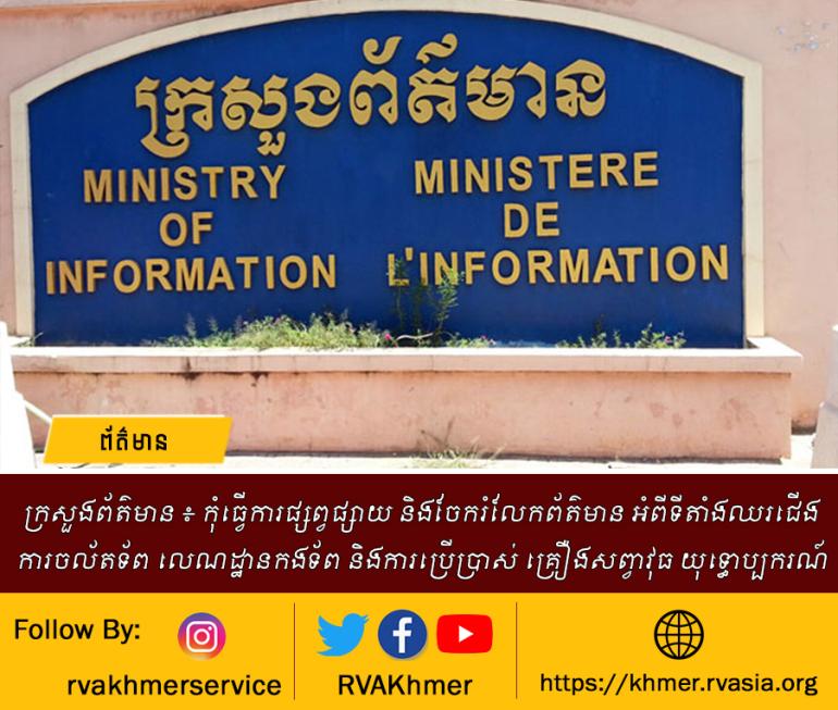 ក្រសួងព័ត៌មាន កុំធ្វើការផ្សព្វផ្សាយ និងចែករំលែកព័ត៌មាន អំពីទីតាំងឈរជើង ការចល័តទ័ព លេណដ្ឋានកងទ័ព និងការប្រើប្រាស់ គ្រឿងសព្វាវុធ យុទ្ធោប្បករណ៍