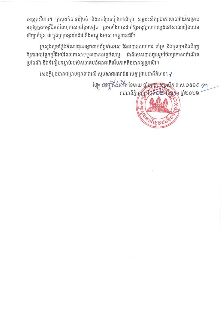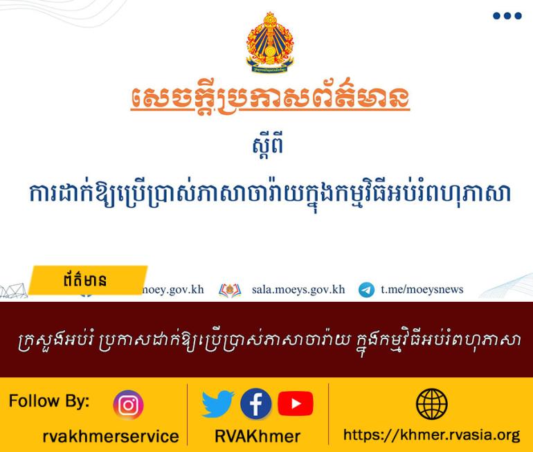 ក្រសួងអប់រំ យុវជន និងកីឡា បានចេញសេចក្តីប្រកាសព័ត៌មាន ដោយប្រកាសពីការដាក់ប្រើប្រាស់ភាសាចារ៉ាយ ក្នុងកម្មវិធីអប់រំពហុភាសា។