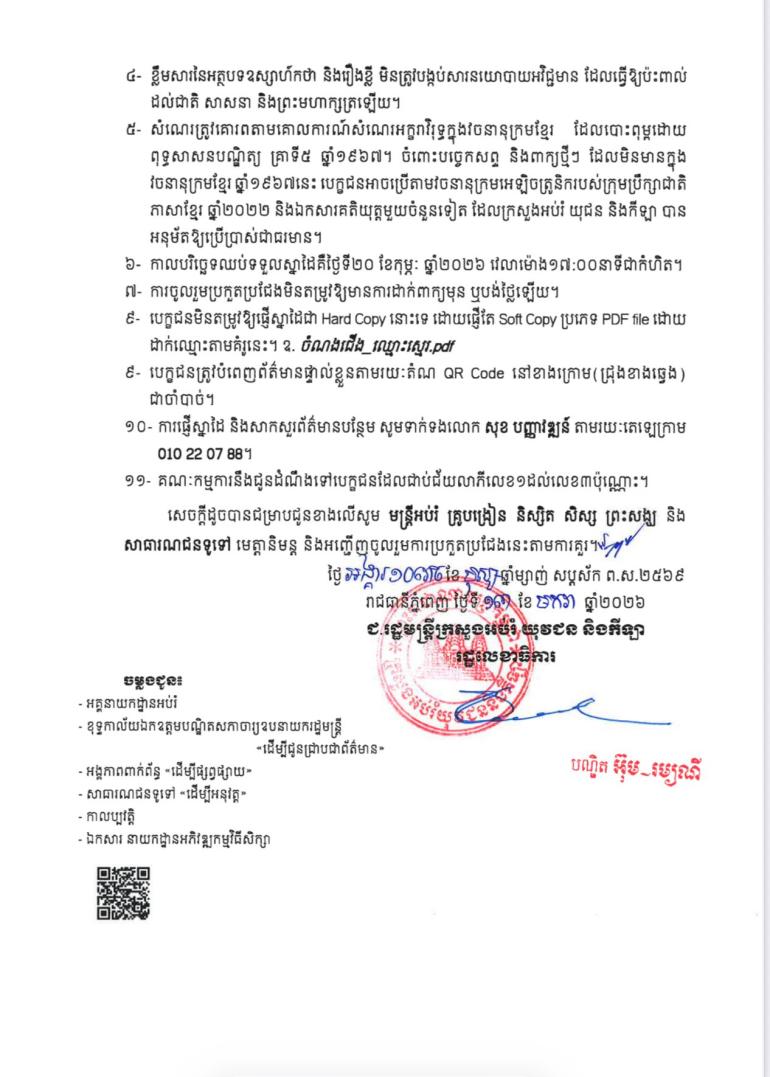ការចូលរួមប្រកួតប្រជែងមិនតម្រូវឱ្យមានការដាក់ពាក្យមុន ឬបង់ថ្លៃឡើយ ដែលបេក្ខជនមិនតម្រូវឱ្យផ្ញើស្នាដៃជា Hard Copy នោះទេ ដោយផ្ញើតែ Soft Copy ប្រភេទ PDF file ដោយ ដាក់ឈ្មោះតាមគំរូនេះ។ ឧ. ចំណងជើង_ឈ្មោះស្មេរ.pd។ បេក្ខជនត្រូវបំពេញព័ត៌មានផ្ទាល់ខ្លួនតាមរយៈតំណ QR Code នៅខាងក្រោម(ជ្រុងខាងឆ្វេង) ជាចាំបាច់។ ការផ្ញើស្នាដៃ និងសាកសួរព័ត៌មានបន្ថែម សូមទាក់ទងលោក សុខ បញ្ញាវឌ្ឍន៍ តាមរយៈតេឡេក្រាម 010 22 07 88។ គណៈកម្មការនឹងជូនដំណឹងទៅបេក្ខជនដែលជាប់ជ័យលាភីលេខ១ដល់លេខ៣ប៉ុណ្ណោះ៕