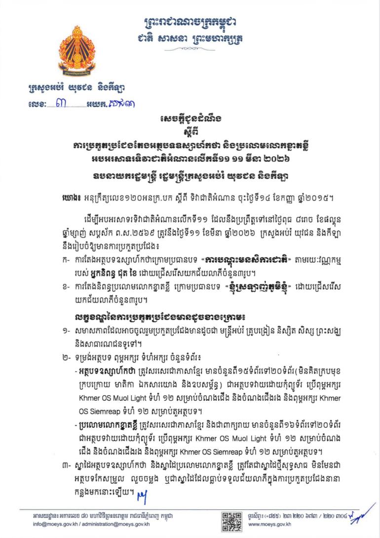 ក្រសួងអប់រំ យុវជន និងកីឡា រៀបចំការប្រកួតប្រជែងតែងអត្ថបទឧស្សាហ៍កថា និងប្រលោមលោកខ្នាតខ្លី អបអរសាទរទិវាជាតិអំណានលើកទី១១ ដែលនឹងប្រព្រឹត្តទៅនៅថ្ងៃទី១១ ខែមីនា ឆ្នាំ២០២៦។ ការតែងអត្ថបទឧស្សាហ៍កថាក្រោមប្រធានបទ «ការបណ្តុះមនសិការជាតិ» តាមរយៈវណ្ណកម្ម របស់ អ្នកនិពន្ធ ជុត ខៃ ដោយជ្រើសរើសយកជ័យលាភីចំនួន៣រូប ខណៈការតែងនិពន្ធប្រលោមលោកខ្នាតខ្លី ក្រោមប្រធានបទ «ខ្ញុំស្រឡាញ់ភូមិខ្ញុំ» ដោយជ្រើសរើស យកជ័យលាភីចំនួន៣រូប។ ការប្រកួតនឹងឈប់ទទួលស្នាដៃនៅថ្ងៃទី២០ ខែកុម្ភៈ ឆ្នាំ២០២៦ វេលាម៉ោង១៧:០០នាទីជាកំហិត។