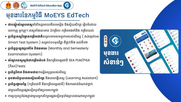បើតាមក្រសួងអប់រំ MoEYS EdTech App គឺជាកម្មវិធីទូរស័ព្ទដៃ ផ្តល់នូវធនធាន និងឧបករណ៍ អប់រំដ៏សម្បូរបែបដែលជួយដល់ ការស្វ័យសិក្សារបស់សិស្សានុសិស្សពីថ្នាក់ទី៧ ដល់ថ្នាក់ទី១២ ដោយប្រើបច្ចេកវិទ្យាទំនើប និងរួមទាំងមានការសម្រិតសម្រាំងតេស្តអនុវត្តសម្រាប់មុខវិជ្ជាសិក្សាទាំង១០ នៅកម្រិតមធ្យមសិក្សាចំណេះទូទៅ។ ចំណែកឯ “បញ្ញាបឋម” គឺជាប្រព័ន្ធបញ្ញាសិប្បនិម្មិតផ្នែកអប់រំដំបូងគេបង្អស់របស់កម្ពុជា ដែលបង្កើតឡើងដើម្បីគាំទ្រទាំងសិស្សានុសិស្ស និងគ្រូបង្រៀន ដែលជួយគ្រូបង្រៀនមុខវិជ្ជា គណិតវិទ្យាប្រកបដោយភាពឆ្លាតវៃ ដោយផ្តល់ជំនួយភ្លាមៗដល់គ្រូបង្រៀននិងសិស្ស តាមរយៈការពន្យល់ជាជំហានៗ ការបង្កើតកិច្ចតែងការបង្រៀន និងការបង្កើតសន្លឹកកិច្ចការបន្ថែមសម្រាប់សិស្សហ្វឹកហាត់ ដែលសម្របតាមល្បឿននៃការសិក្សារបស់សិស្សម្នាក់ៗ។