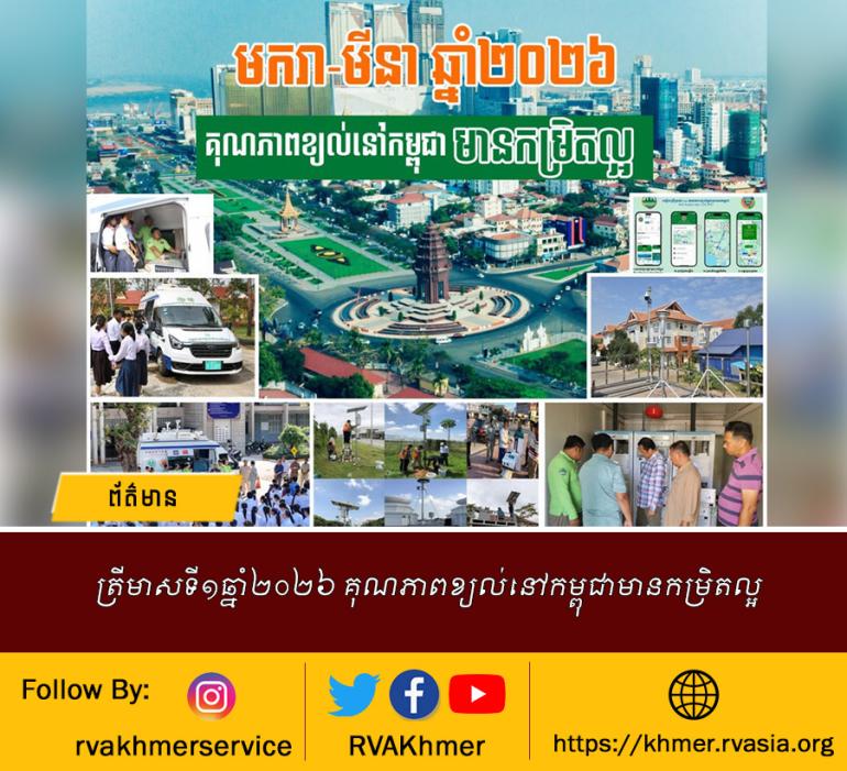 តាមរយៈការត្រួតពិនិត្យគុណភាពខ្យល់ពីឧបករណ៍ និងស្ថានីយ ដែលបានដំឡើងនៅ ទូទាំងប្រទេស ចំនួន៥៩ទីតាំង (នៅរាជធានីភ្នំពេញចំនួន១២ទីតាំង និងតាមបណ្ដាខេត្តទូទាំងប្រទេសចំនួន៤៧ទីតាំង) បានបង្ហាញថា គុណភាពខ្យល់នៅរាជធានីភ្នំពេញ និងបណ្ដាខេត្ត ក្នុងត្រីមាសទី១ ឆ្នាំ២០២៦នេះ ស្ថិតក្នុងកម្រិតល្អបើធៀបទៅនឹងស្តង់ដាគុណភាពខ្យល់សាធារណៈ។