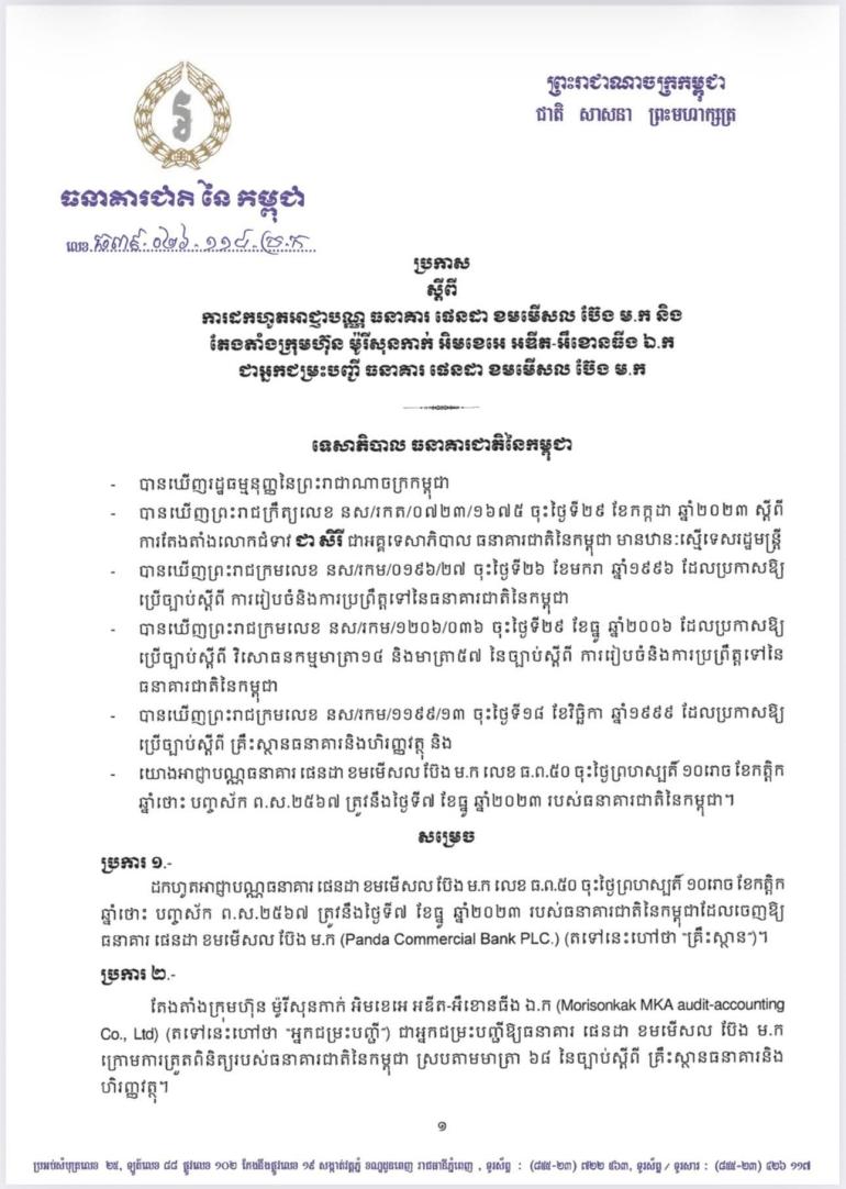 ធនាគារជាតិនៃកម្ពុជា ដកហូតអាជ្ញាបណ្ណធនាគារផេនដា