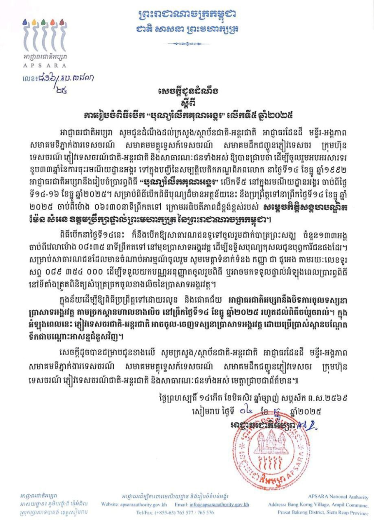 ក្នុងន័យដើម្បីឱ្យពិធីប្រព្រឹត្តទៅដោយរលូន និងជោគជ័យ អាជ្ញាធរជាតិអប្សរា នឹងបិទការចូលទស្សនា ប្រាសាទអង្គរវត្ត តាមច្រកស្ពានហាលខាងលិច នៅព្រឹកថ្ងៃទី១៤ ខែធ្នូ ឆ្នាំ២០២៥ រហូតដល់ពិធីចប់រួចរាល់។ ក្នុងអំឡុងពេលនេះ ភ្ញៀវទេសចរជាតិ-អន្តរជាតិ អាចចូល-ចេញទស្សនាប្រាសាទអង្គរវត្ត ដោយប្រើប្រាស់ស្ពានបណ្តែត ទឹកជាបណ្តោះអាសន្នជំនួសវិញ៕