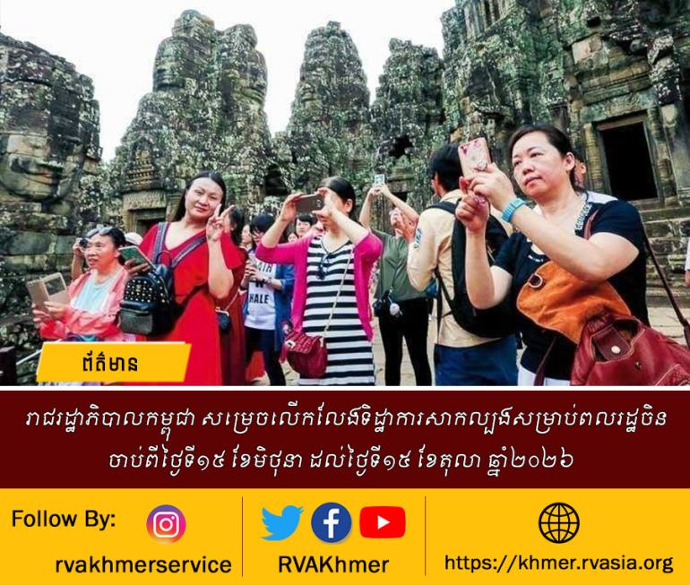រាជរដ្ឋាភិបាលកម្ពុជា សម្រេចលើកលែងទិដ្ឋាការសាកល្បងសម្រាប់ពលរដ្ឋចិន ចាប់ពីថ្ងៃទី១៥ ខែមិថុនា ដល់ថ្ងៃទី១៥ ខែតុលា ឆ្នាំ២០២៦