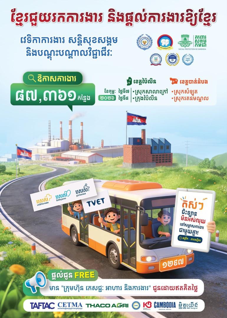 ក្រសួងការងារ និងបណ្ដុះបណ្ដាលវិជ្ជាជីវៈតាមរយៈវេទិកាការងារ សន្តិសុខសង្គម និងបណ្តុះបណ្តាលវិជ្ជាជីវៈ គ្រោងនាំយកឱកាសការងារចំនួន ៨៧ ៣៦១កន្លែងសម្រាប់បងប្អូនអតីតពលករខ្មែរដែលទើបត្រឡប់មកពីប្រទេសថៃ និងប្រជាពលរដ្ឋខេត្តបាត់ដំបង និងប៉ៃលិន នៅថ្ងៃទី០៧-០៨ ខែកុម្ភៈខាងមុខនេះ។