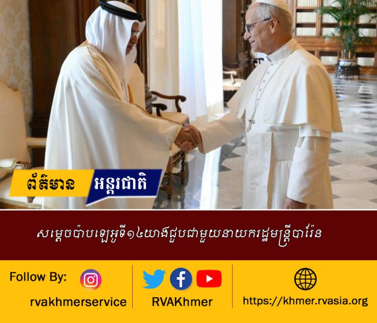 វ៉ាទីកង់ញូវបានរាយការណ៍ថា សម្តេចប៉ាបឡេអូទី១៤ កាលពីថ្ងៃច័ន្ទបានយាងទទួលជួបជាមួយនាយករដ្ឋមន្ត្រីនៃប្រទេស បារ៉ែន ព្រះអង្គម្ចាស់ សាល់ម៉ាន ប៊ិន ហាម៉ាត អាល់ ខាលីហ្វា ( Salman bin Hamad Al Khalifa )នៅបុរីវ៉ាទីកង់។