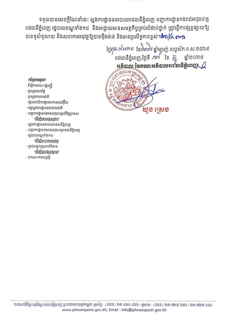 ស្នងការដ្ឋាននគរបាលរាជធានីភ្នំពេញ បញ្ជាការដ្ឋានកងរាជអាវុធហត្ថរាជធានីភ្នំពេញ និង គណៈបញ្ជាការឯកភាពរដ្ឋបាលខណ្ឌទាំង១៤ ត្រូវបង្កើនការយកចិត្តទុកដាក់ តាមដានចាត់ចែង និងគ្រប់គ្រងសភាពការណ៍ឱ្យបានល្អប្រសើរ ក្នុងករណីពិនិត្យឃើញមានជនណាបំពាននូវ សេចក្តីណែនាំនេះ ត្រូវចាត់វិធានការជាបន្ទាន់៕