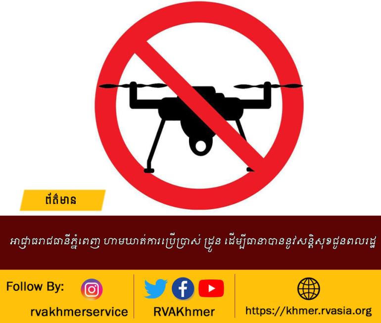 សេចក្ដីណែនាំរបស់ រដ្ឋបាលរាជធានីភ្នំពេញ នៅថ្ងៃទី១៧ ធ្នូ នេះ ថា «ហាមដាច់ខាតការប្រើប្រាស់អាកាសយានគ្មានមនុស្សបើក (ដ្រូន) គ្រប់ប្រភេទ ក្នុងភូមិសាស្ត្រ រាជធានីភ្នំពេញ។ ជនណាដែលបំពាន ឬប្រើប្រាស់អាកាសយានគ្មានមនុស្សបើក (ដ្រូន) ដោយគ្មានការអនុញ្ញាត ពីរដ្ឋបាលរាជធានីភ្នំពេញ ត្រូវទទួលខុសត្រូវទាំងស្រុងនៅចំពោះមុខច្បាប់ជាធរមាន»។