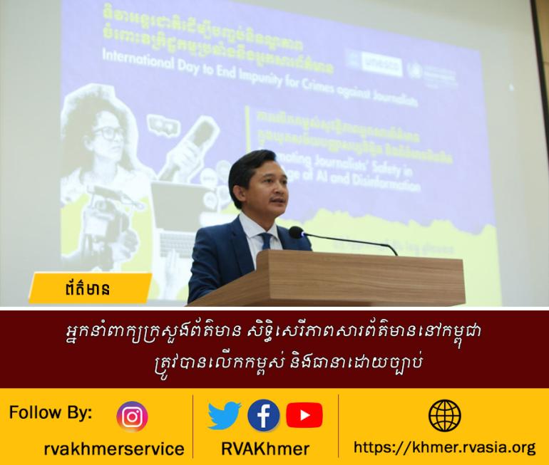 អ្នកនាំពាក្យក្រសួងព័ត៌មាន ថ្លែងបែបនេះ ក្នុងឱកាសទិវាអន្តរជាតិបញ្ចប់វប្បធម៌និទណ្ឌភាពចំពោះឧក្រិដ្ឋកម្មប្រឆាំងនឹងអ្នកសារព័ត៌មាន រៀបចំឡើងដោយការិយាល័យឧត្ដមស្នងការអង្គការសហប្រជាជាតិទទួលបន្ទុកសិទ្ធិមនុស្ស (OHCHR) និងអង្គការយូណេស្កូ (UNESCO) នារសៀលថ្ងៃទី ០៤ ខែធ្នូ ឆ្នាំ២០២៥ នៅរាជធានីភ្នំពេញ។