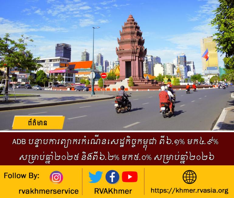 ធនាគារអភិវឌ្ឍន៍អាស៊ី (ADB) បានបន្ថយការព្យាករកំណើនសេដ្ឋកិច្ចសម្រាប់កម្ពុជាពី៦.១% មក៤.៩% សម្រាប់ឆ្នាំ ២០២៥ និងពី៦.២% មក៥.០% សម្រាប់ឆ្នាំ២០២៦ ដោយឆ្លុះបញ្ចាំងពីបញ្ហាប្រឈមសេដ្ឋកិច្ច ទាក់ទងនឹងភាពតានតឹងភូមិសាស្ត្រនយោបាយជាមួយប្រទេសថៃ និងភាពមិនច្បាស់លាស់ជុំវិញទីផ្សារនាំចេញទៅសហរដ្ឋអាមេរិក។