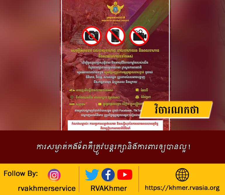 យើងទាំងអស់គ្នា គួរតែគោរពតាមការអំពាវនាវជាថ្មីរបស់ ក្រសួងការពារជាតិដោយបានស្នើសុំសូមឱ្យយើងទាំងអស់គ្នា បញ្ឈប់ការផ្សព្វផ្សាយជាបន្ទាន់នូវរាល់ព័ត៌មាន វីដេអូ សារសំឡេង ឬរូបភាពដែលអាចបង្ហាញពីសកម្មភាពមុន អំឡុងពេល និងក្រោយពេលប្រតិបត្តិការយោធាទាំងអស់។