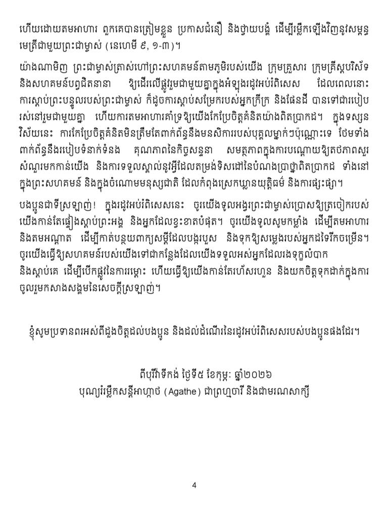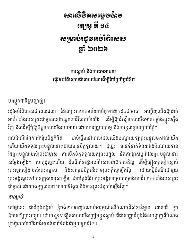 សារសម្តេចប៉ាប សារលិខិតសម្តេចប៉ាបឡេអូទី១៤ សម្រាប់រដូវអប់រំពិសេសឆ្នាំ២០២៦ By Khmer Service, 18 February, 2026 Your name Comment Daily Program Click for Audio Archive More សារសម្តេចប៉ាប សារសម្តេចប៉ាប សារលិខិតសម្តេចប៉ាបហ្វ្រង់ស៊ីស្កូ ក្នុងរដូវអប់រំពិសេស ឆ្នាំ២០២៥ «ចូរយើងធ្វើដំណើររួមគ្នាក្នុងសេចក្តីសង្ឃឹម» សារសម្តេចប៉ាប (Pope message)សម្តេចប៉ាប ទេវវិទ្យាជាមគ្គុទេសតម្រង់ផ្លូវឆ្លងកាត់វិបត្តិនៃជីវិតនានា សារសម្តេចប៉ាប សម្តេចប៉ាប អំពាវនាវឱ្យមាន «ទេវវិទ្យានៃសេចក្តីស្រឡាញ់»