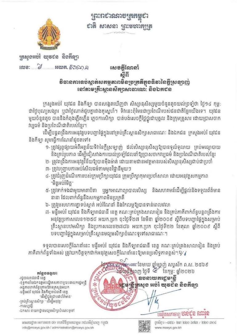 ក្រសួងអប់រំ នាថ្ងៃទី០៥ ខែកុម្ភៈ ឆ្នាំ២០២៦ បានដាក់ចេញនៅគោលការណ៍ណែនាំចំនួន ៧ចំណុច ដើម្បីពង្រឹង និងរក្សាឱ្យបាននូវសីលធម៌ និងភាពថ្លៃថ្នូររបស់សិស្សានុសិស្សកុំឱ្យមានការភ្លើតភ្លើន ប្រាសចាកវប្បធម៌និងប្រពៃណីរបស់ជាតិខ្មែរ សម្រាប់អនុវត្តនៅក្នុងគ្រប់គ្រឹះស្ថានសិក្សានៅក្នុងឱកាសទិវានៃក្តីស្រលាញ់ខាងមុខនេះ។