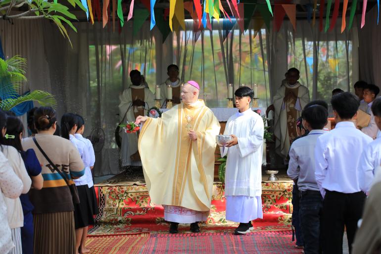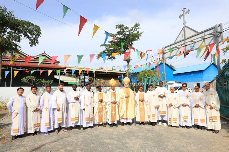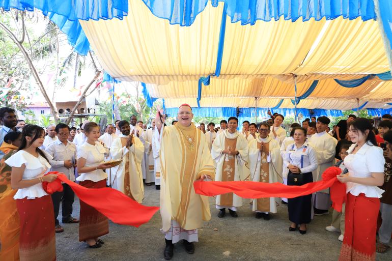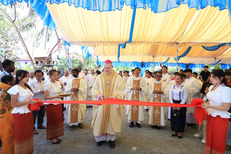 The ceremony was held on December 13 in Traeng Trayeng Commune, Phnom Sruoch District, Kampong Speu Province, to support and enhance the pastoral mission and activities of Saint Martin Church of this parish. In the context of the conflict between Cambodia and Thailand, Bishop Olivier urged the faithful to pray and to continue works of charity. He said, “As Catholics, we have a power, and that power is prayer—prayer for peace to come, not tomorrow, not the day after, but today.