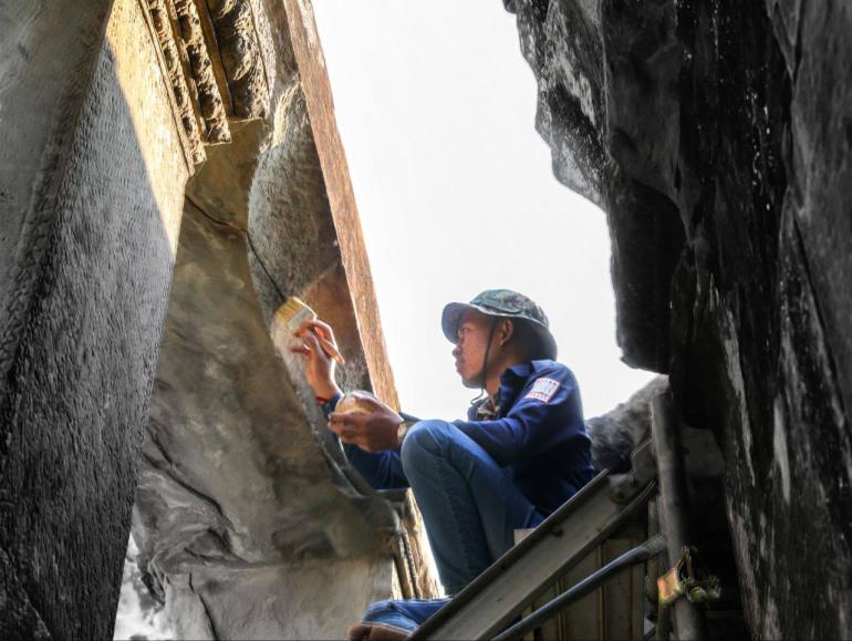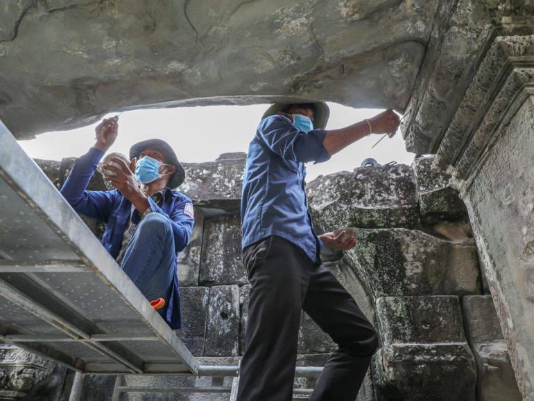 អ្នកជំនាញកំពុងព្យាបាលថ្មពុកផុយនៅបណ្ណាល័យខាងជើងជាន់ទី២ ប្រាសាទអង្គរវត្ត