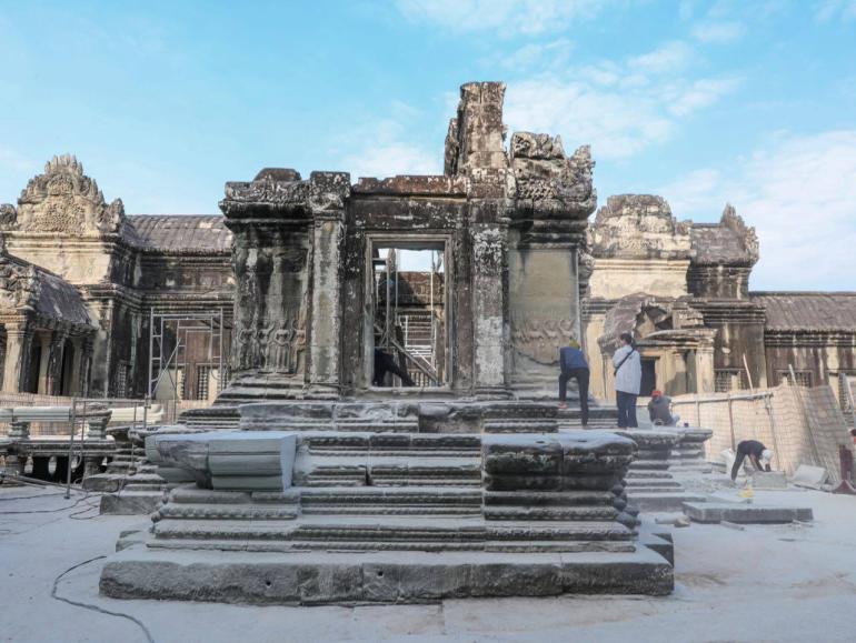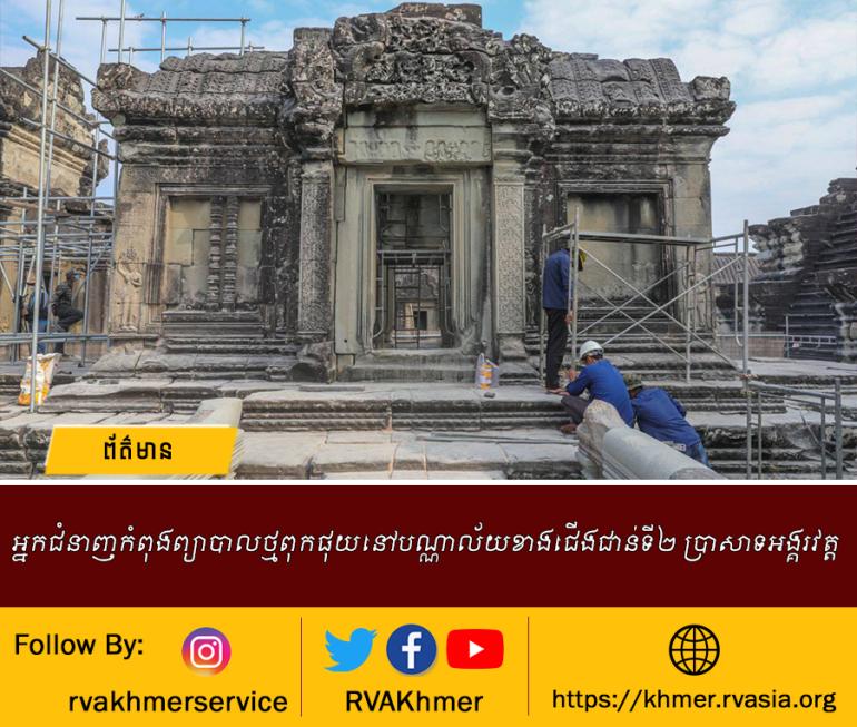 អាជ្ញាធរជាតិអប្សរាតាមរយៈក្រុមអភិរក្សថ្ម នៃនាយកដ្ឋានអភិរក្សប្រាសាទ និងបុរាណវិទ្យា កំពុងជួសជុលពង្រឹងថ្មនៅបណ្ណាល័យខាងជើង នៃជាន់ទី២ប្រាសាទអង្គរវត្ត ខណៈដែលថ្មទាំងនោះមានការពុកផុយ ប្រេះបែក ដោយសារកត្តាធម្មជាតិ និងអាយុកាល។